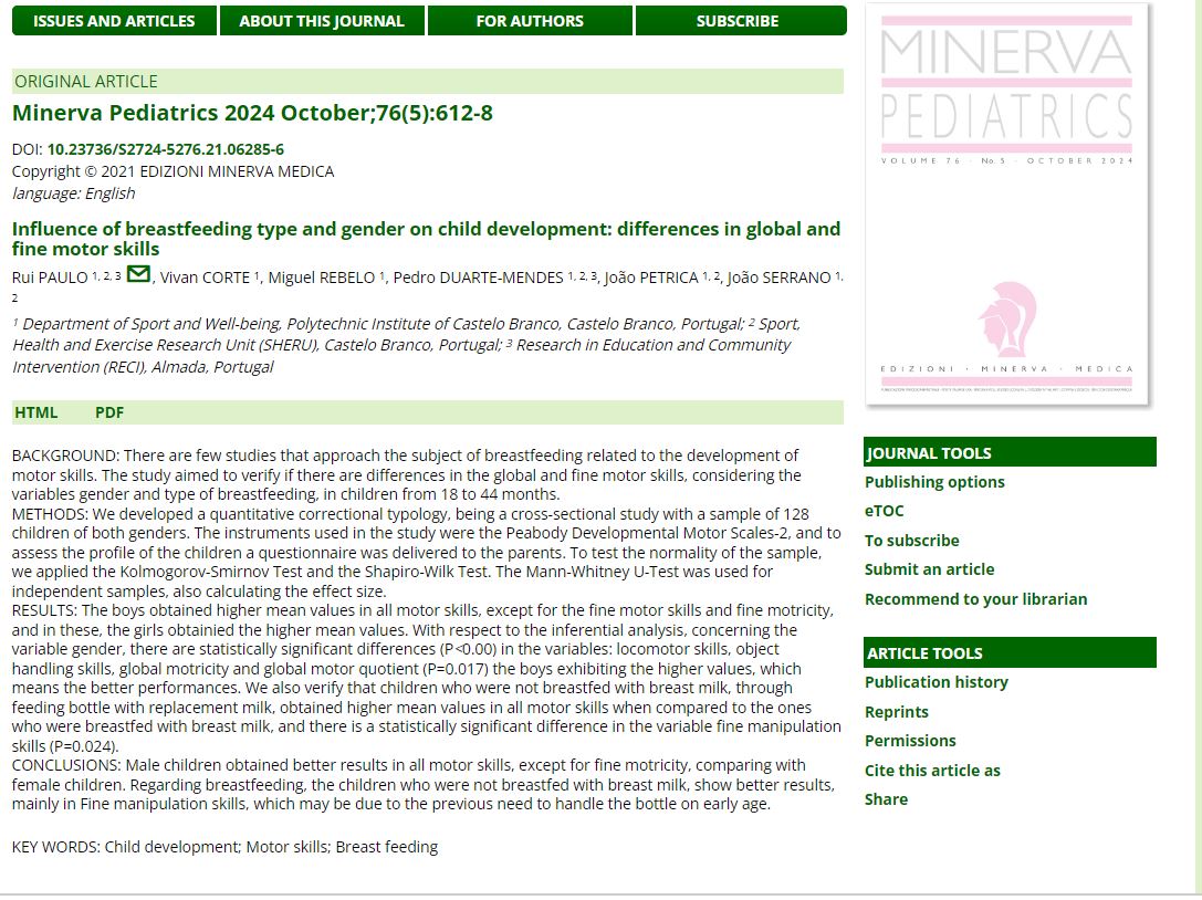 Conclusions: Male children obtained better results in all motor skills, except for fine motricity, comparing with female children. Regarding breastfeeding, the children who were not breastfed with breast milk, show better results, mainly in Fine manipulation skills, which may be due to the previous need to handle the bottle on early age.