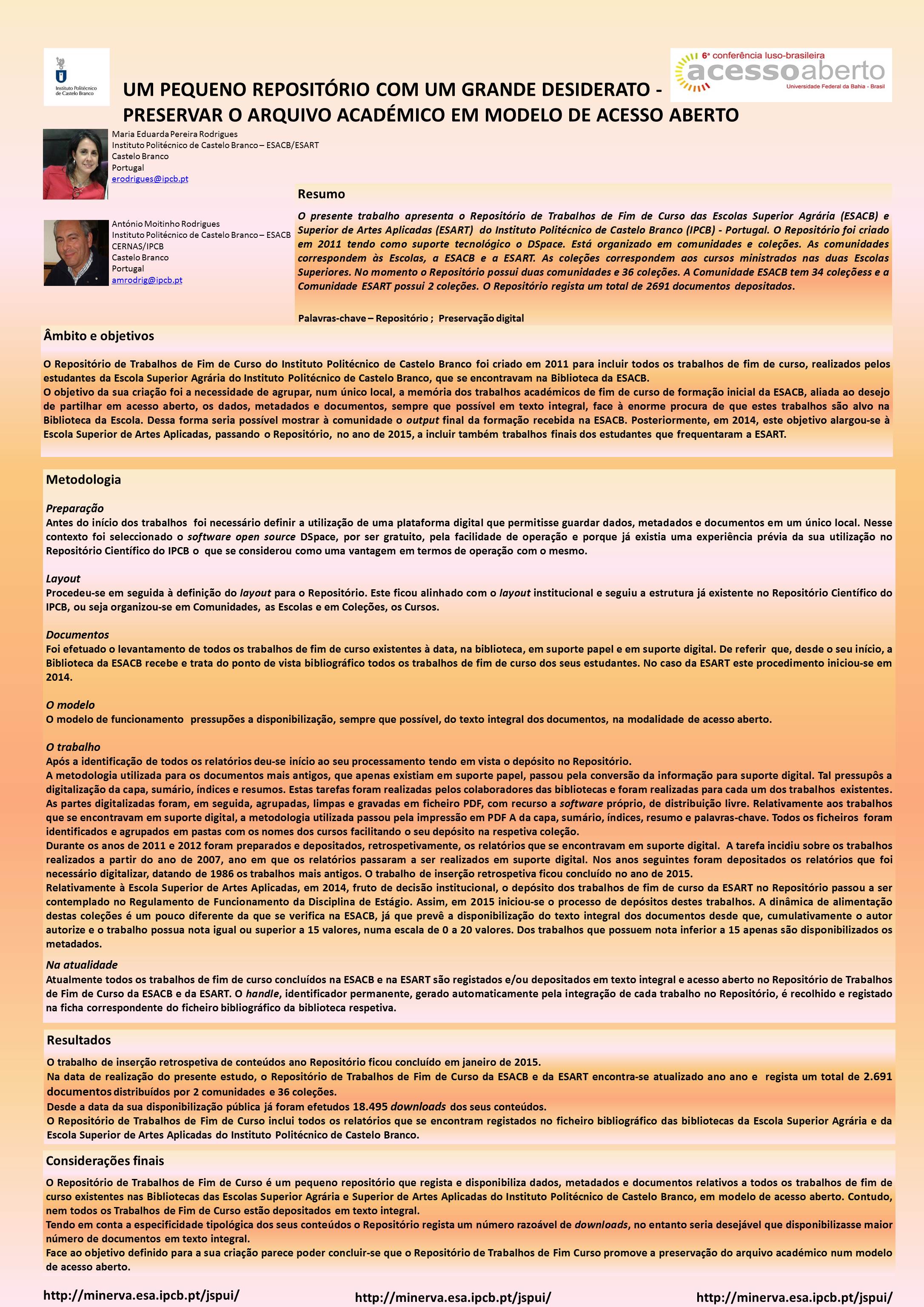 RODRIGUES, M.E.R. ; RODRIGUES, A.M. (2015) - Um pequeno repositório com um grande desiderato : preservar a memória académica em modelo de acesso aberto. In Conferência Luso-Brasileira de Acesso Aberto, 6, Salvador (Bahia, Brasil), 5-7 Out. , 2015. Póster aceite.